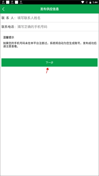 接着在发布报价时,填写企业名称、个人姓名以及联系电话,之后点击下一步。