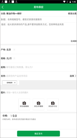 (3)在发布页面填写相关信息,进入产品发布供应信息页面后,填写标题、描述产品,并选择产地与规格;上传产品主图、详情图以及相关经营许可证(特种养殖、农药兽药等产品在此处必须上传),这有助于推动交易达成。输入价格,若输入为0,生成的供应页面价格将显示为面议。信息填写完毕后,点击确定发布。发布成功会出现一个提交成功页面,您可选择继续发布。若您已注册并登录,可前往个人中心的“我的供应”查看已发布的供应信息。