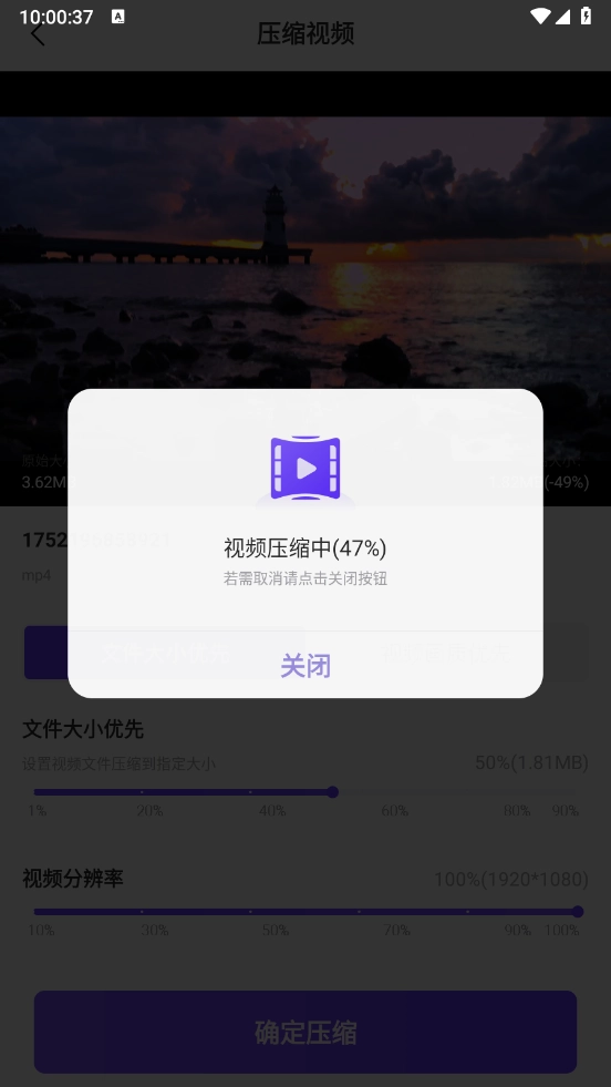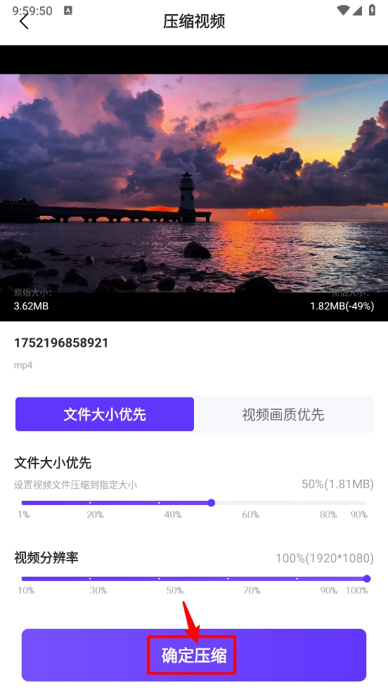 5、接下来选择文件大小、视频分辨率以及视频画质,选择完毕后点击“确定压缩”。