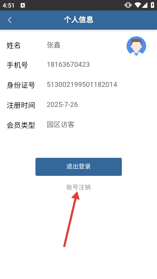 3、进入个人信息页面后,选择【账号注销】选项,即可发起账号注销流程。
