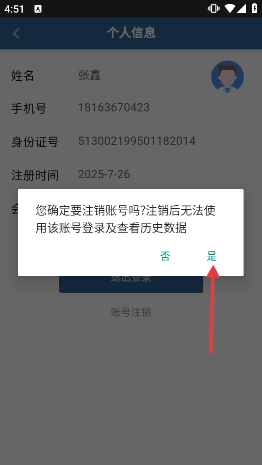 4、在注销确认弹窗,点【是】,确认后账号将注销。