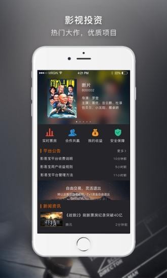 影易宝app——轻松打造专业影视投资人影易宝app与每个人共享影视投资欢乐。用户能够低门槛赚取票房分红、零距离接触明星和影视幕后。当前影视产业正处于高速发展期,影易宝创建影视收益权服务平台,遴选优质作品,在这里任何人都可以轻松成为专业影视投资人,分得所投项目实际收益。同时赠送电影票让用户和朋友一起鉴赏您所投的电影,娱乐圈福利发不停!