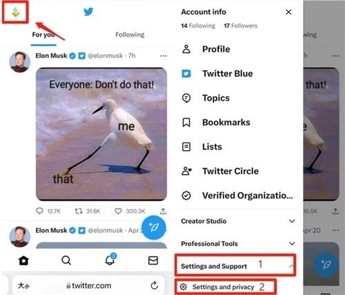 1. 第一步,登录推特,点击左上角头像,进入页面后向下滑动,找到并点击“Settings and Support”,接着点击“Settings and privacy”。
