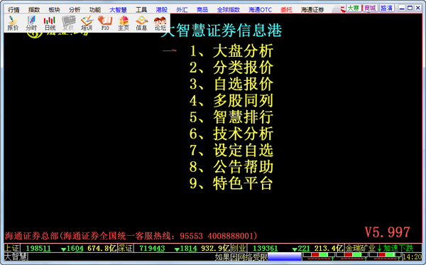 1、大智慧所有功能在菜单中 可实现。更加提供快捷菜单功能,将常用热键摆在您手边。2、如果您在操作中遇到什么困难,只需按Alt+H,就可以立刻得到当前画面下的操 作提示。 除此之外,在"帮助"菜单中也包括了对大智慧的基本功能和特色功能以及特色指标的介绍。
