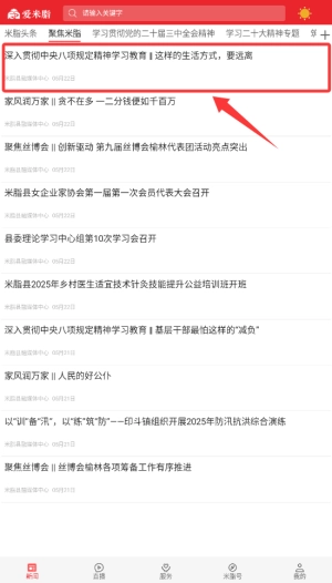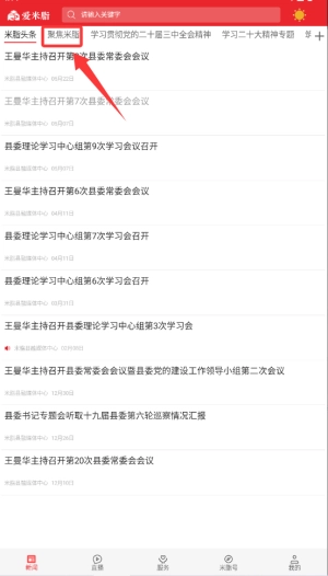 1. 开启爱米脂后,于首页显眼之处寻得红色的“聚焦米脂”栏目入口,点击该入口就能进入本地热点新闻聚合页面。