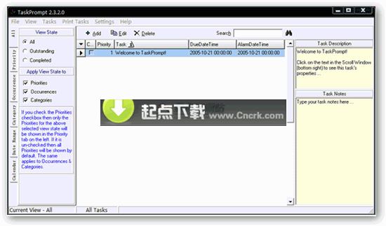 TaskPrompt 2.3.2.0 英文绿色免费版 TaskPrompt 允许你管理一个私人的 ToDo 和任务列表.该软件提供了一个带有集成的允许你在所选择的日期期间快速地浏览任务的日历显示管理.该软件还可以从系统托盘使用一个信息提醒你到期的项目并且允许你根据优先权和分类组织你的任务.任务显示可以按照日期范围,状况和其它属性进行过滤