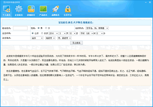百岁老爷爷起名软件是一款根据您的出生时辰量身定制,这款起名软件基于姓名学三才五格生肖喜忌音形意等多方面综合考虑,从浩瀚的汉字组合中筛选出所有五行、五格和寓意都没有缺陷的名字。