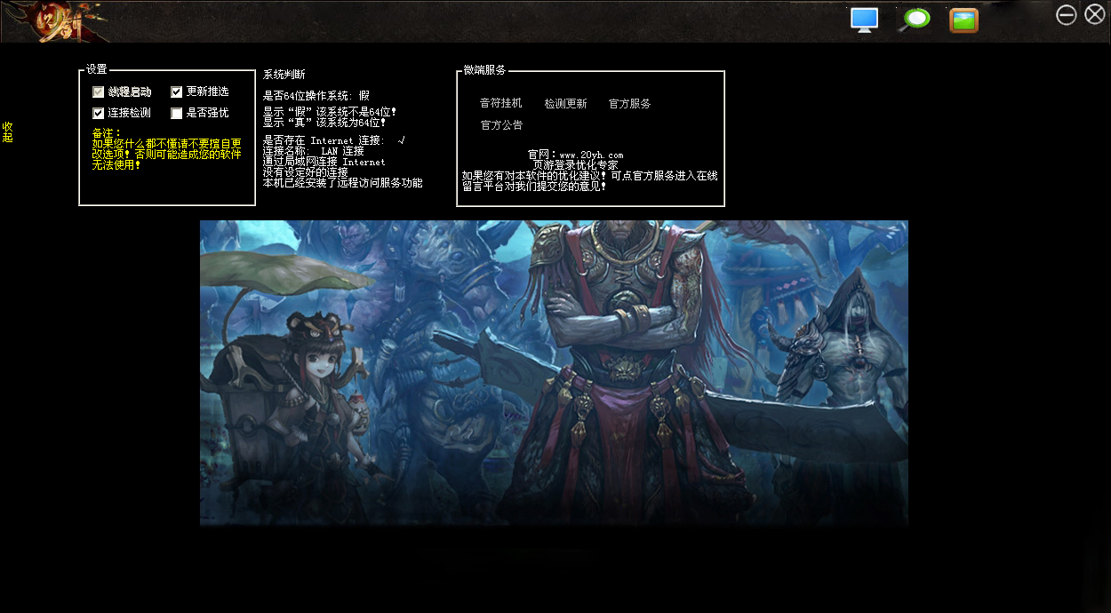 问剑超微端由页游专业优化团队音符TEAM为网页游戏倾力打造的游戏登陆优化工具。软件主要用于辅助玩家快速登陆游戏和画面优化等。软件有点类似于官方微型客户端。