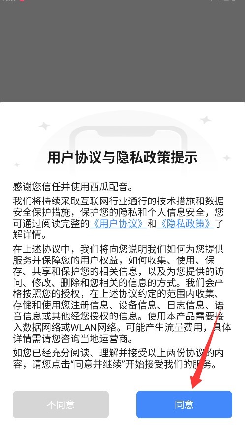 1、启动西瓜配音APP,初次使用时需要同意用户协议和隐私政策,点击“同意”后即可进入主界面。