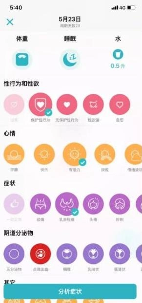 点击私人健康笔记,用户可以便捷记录心情、症状、性生活、体温、服药情况等各类信息。
