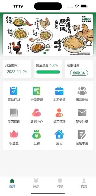 为老乡鸡加盟商户打造的移动端专业门店管理工具,集成了招募运营、合同履约、筹店筹备、物资采购、财务核算及数据看板等核心功能模块。
