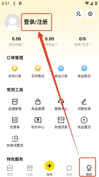 在启动软件进行操作前,需要先完成账号登录步骤,具体操作是点击界面中的【我的】选项,然后选择登录或注册入口。