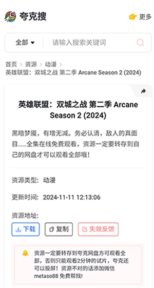 找到对应的资源后,进入详情页,要通过夸克网盘来访问该资源,操作上只需点一下复制按钮就行。