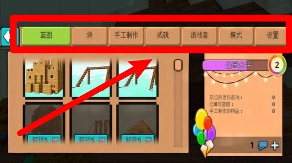 点击顶部菜单栏,即可进入蓝图、方块、手工制作等多个功能分类,你可以自由切换不同模块来开展建造操作。