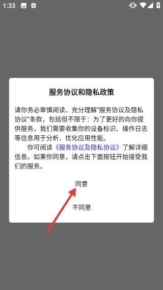 启动应用程序后,当界面弹出“服务协议与隐私政策”的提示窗口时,点击窗口中的【同意】按钮,以此确认并接受相关协议条款。
