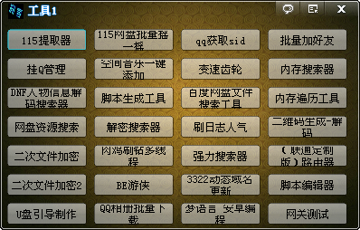 115提取器、115网盘批量摇一摇、qq获取sid、批量加好友、挂Q管理、空间音乐一键添加、变速齿轮、内存搜索器、DNF人物信息解码搜索器、脚本生成工具等。