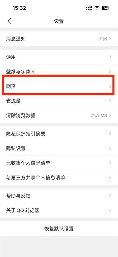3、接着进入我的设置后,点击上方【网页】进入;