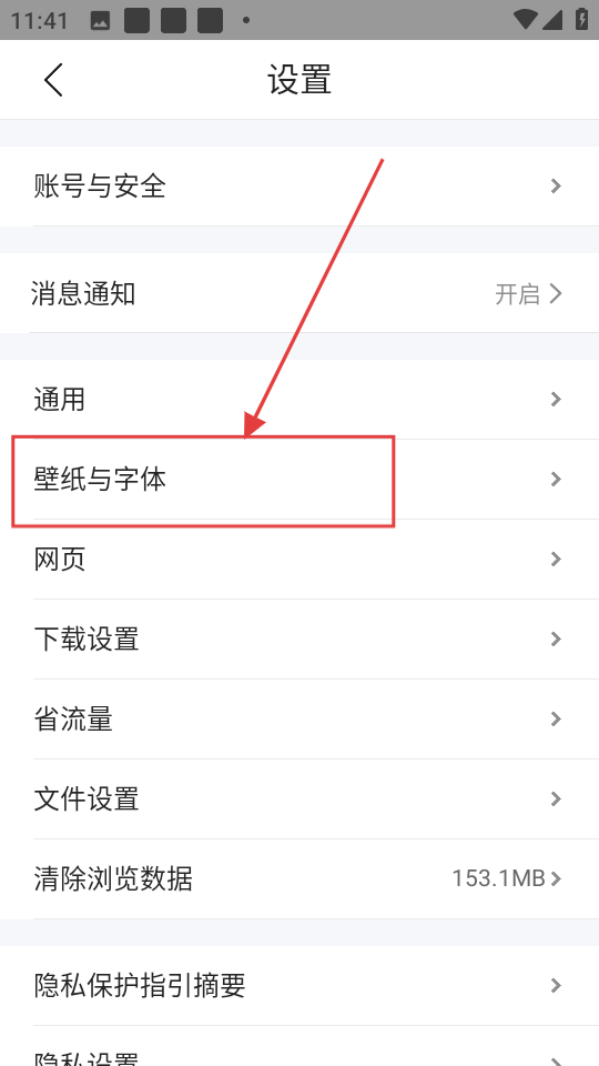 2、进入【设置】页面后,找到并点击【壁纸与字体】这一选项,即可进入字体相关的设置界面。