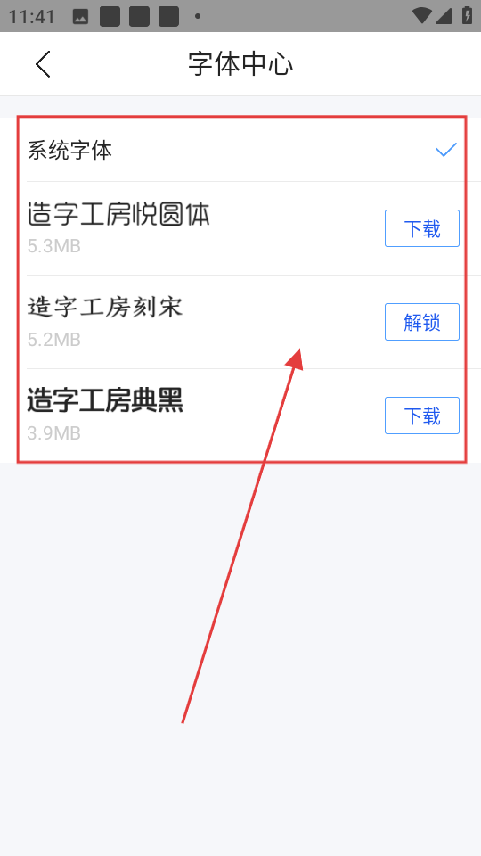 4、进入【字体中心】,这里提供多种字体选项,比如【造字工房悦圆体】【造字工房刻宋】等,大家可以根据自己的喜好选择已有的字体,或者解锁新字体使用。