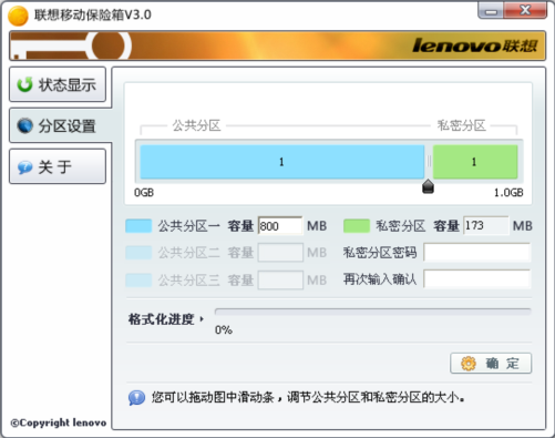 设置分区数量和容量后,输入私密分区密码,点击“确定”按钮,进入到分区格式化过程。分区格式化成功后,软件会弹出相应提示,此时表示分区设置成功完成。