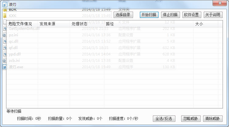 凌刃病毒扫描器是一款小巧绿色免安装的病毒扫描器,凌刃病毒扫描软件可以快速对系统进行扫描,将有问题的文件以列表形式列出来,用户可以选择清除威胁或忽略威胁,避免误删。