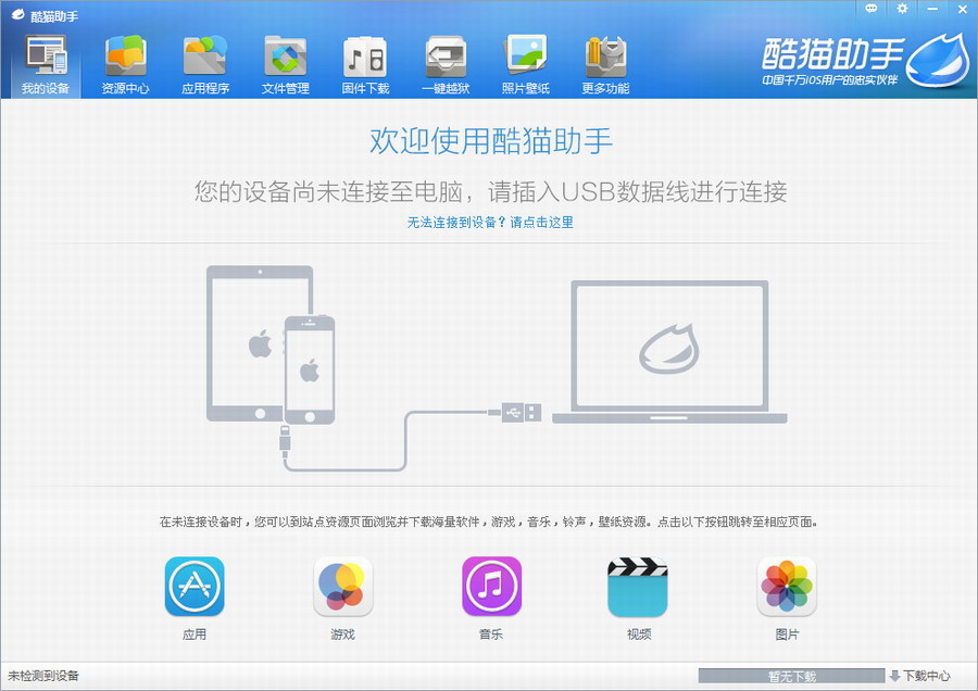酷猫助手有精选百万游戏与应用,无需越狱,即可一键安装正版.各种新款游戏,第一时间上架, 免费抢玩!更加简单,快速的管理你的iOS设备.软件,音乐,视频,图片,铃声,图书,任你导入导出,彻底摆脱iTunes。