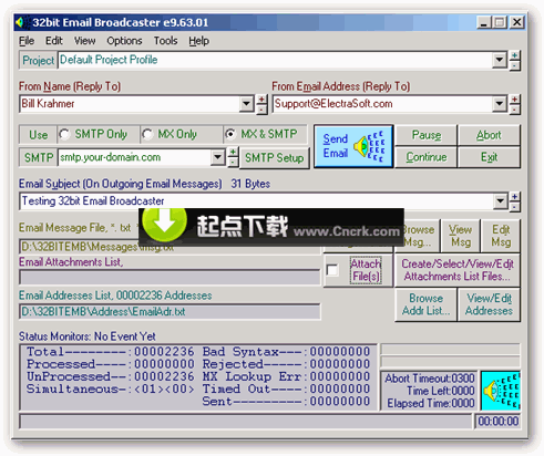32bit Email Broadcaster(电子邮件群发) 08.03.01 英文绿色特别版 一个简单易用而又强有力的电子邮件群发程序,它既可以用于商业应用也可以用于个人应用。对于那些需要发送新闻,通知,广告的人来说十分有用。您可以使用它轻松的将您的讯息发送给给地址列表中的每一个人,可以是一个人乃至成千上万个收件人,当您批量发送邮件时,不会加上额外的CC头信息和广告头信息,它也可以发送HTML格式的信件