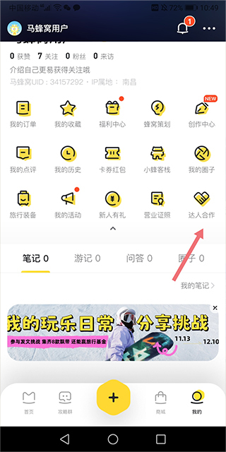 用户可以通过马蜂窝app【我的】页面中点击【达人合作】