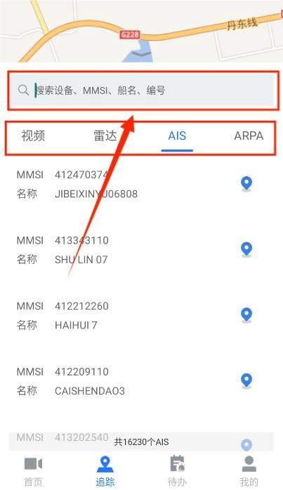 可以在输入框填写设备名、MMSI、船名、编号等信息来查询船只,也能借助下方的视频、雷达、AIS、ARPA等信息查找船只。