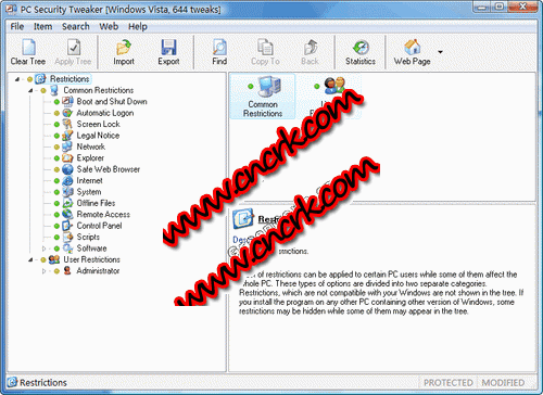 pc security tweaker一款安全优化辅助软件。你可以用来优化安装有windows操作系统的计算机。你可以控制对控制面板里的程序,比如:显示、网络、密码、打印机、系统、添加删除程序等的访问。另外,你可以禁用开始菜单中的某项、锁定保护我的电脑里的磁盘分区,禁用dos、命令提示符、注册表编辑、任务栏、任务管理器、网络访问。可以隐藏桌面图标等等。你还可以用密码保护windows系统并限制用户只能运行特定的程序。安全优化可以全局使用或者针对特定用户。该软件还让你优化ie,使之安全地浏览网页。该版本带有屏幕锁定