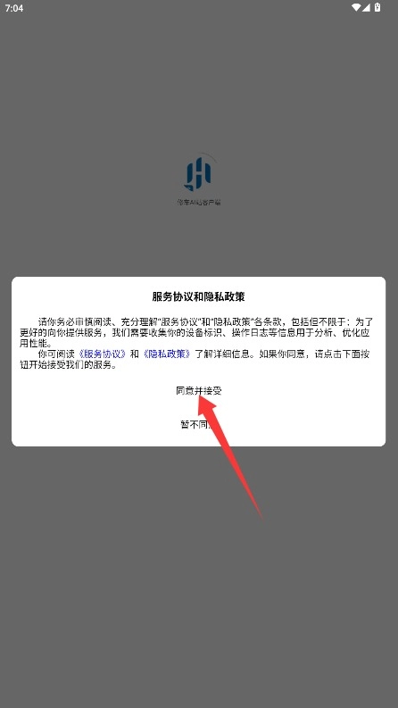 首次使用时,请仔细阅读平台的服务条款和隐私政策,在确认无误后,点击“同意并接受”按钮即可进入应用。