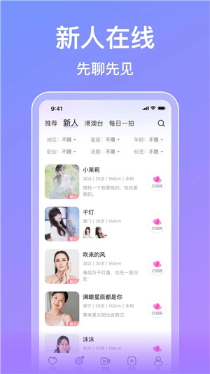 平台上还设有不少趣味十足的功能助力用户寻觅伴侣,缘分速配便是其中之一。该功能依托地理位置、兴趣喜好、交友标签、个人资料等多维度信息,为契合彼此调性的异性用户实现快速匹配,并通过视频聊天的方式,推动双方建立情感层面的互动与联结。