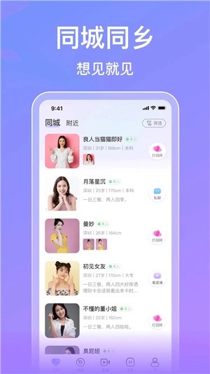 当前面四步都完成后,我们就可以开始使用觅伊进行聊天,寻找心动的异性。在交友首页上,有很多同城、附近的异性,我们可以看到她们的年龄、位置等相关交友资料。