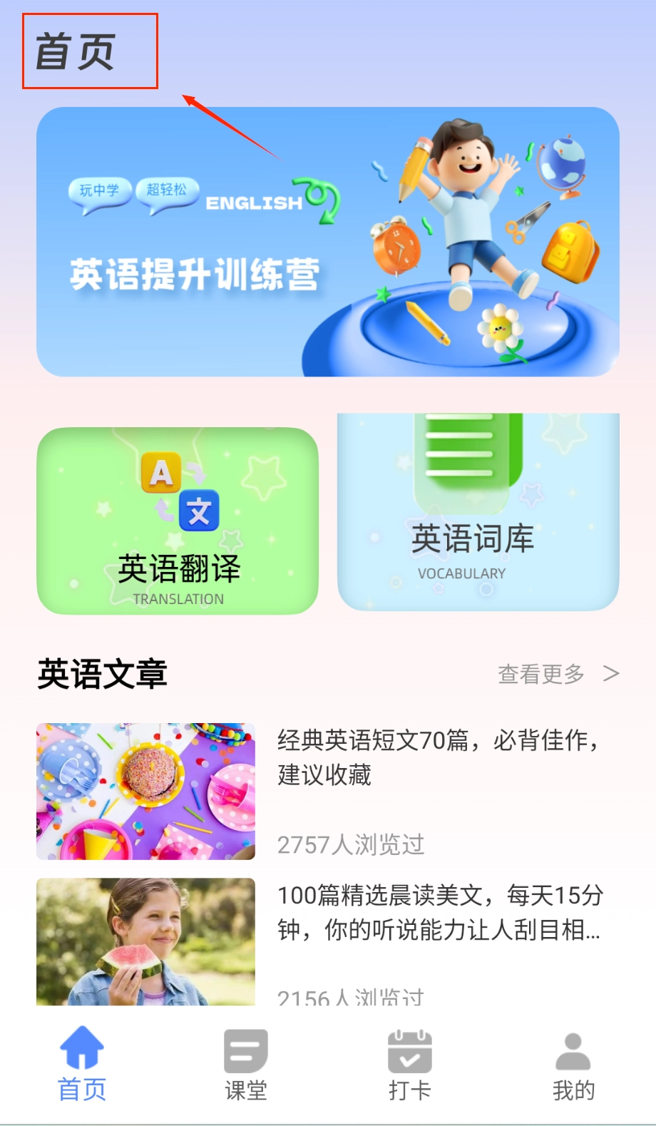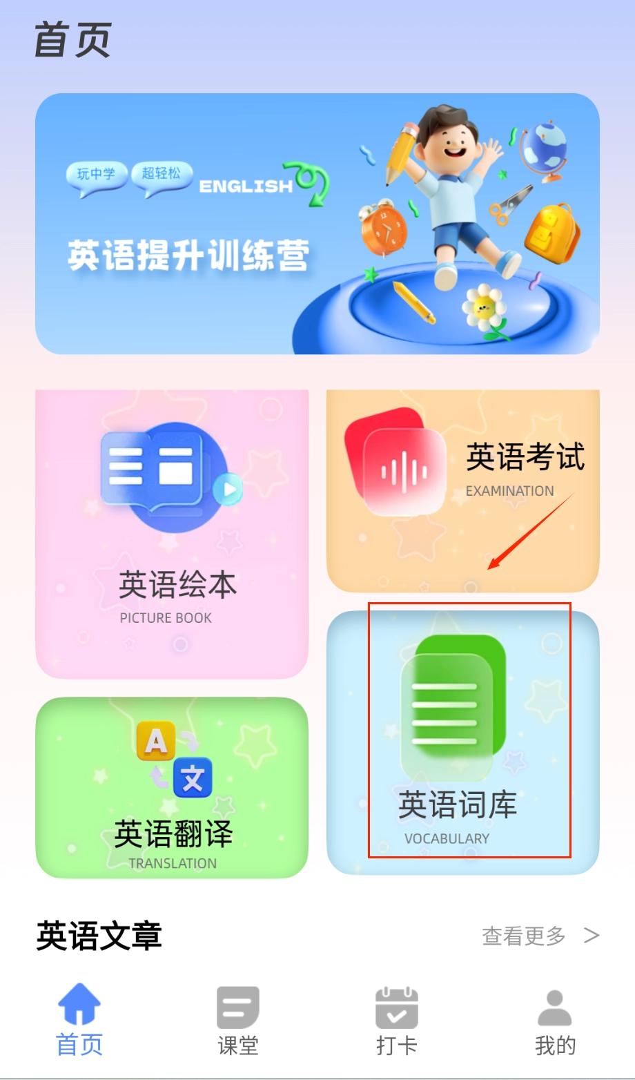 1、启动应用后自动进入智能导航主界面,用户可滑动浏览词汇库、经典美文、听力专区等核心功能模块卡片,点击任意板块即可根据当前学习。
