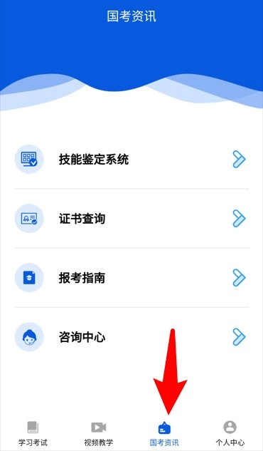 “国考资讯”页面支持查询技能鉴定、考试指南、证书信息等内容,实用信息可一站式获取。
