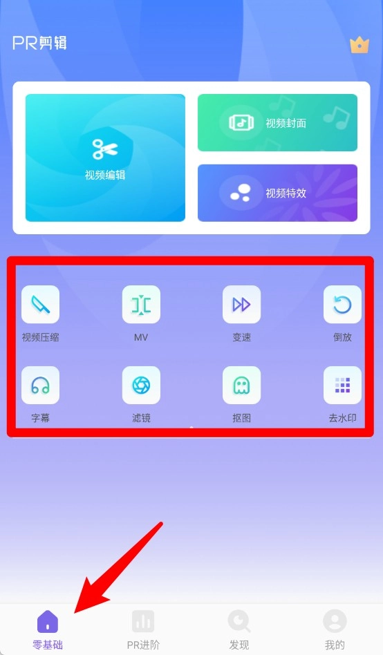 在“零基础”页面,新手可以使用视频压缩、添加字幕、滤镜变速等功能,轻松快速地上手视频制作。