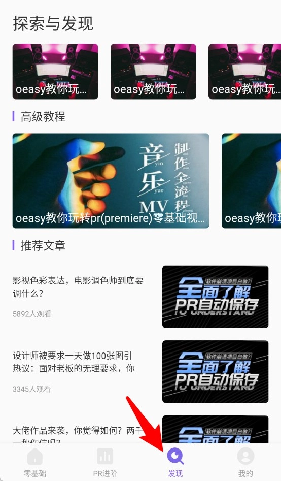 “发现”页面集合了高级教程与推荐文章,适合具备一定基础的用户去探索更进阶的剪辑内容。