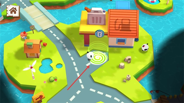 进入游戏界面后,能看到熊猫角色位于迷宫场景中,需要操控这个角色朝着目标区域(带有螺旋标识的地方)移动,这个场景里包含了建筑、水域等多种元素。