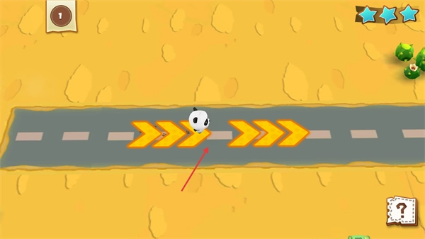 进入关卡后,熊猫角色要顺着道路移动,黄色箭头是行进的指引,得避开障碍朝着目标方向前进,界面右侧设有提示按钮能帮助通关。