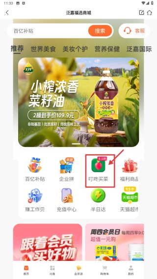 在惠福利页面,点击叮咚买菜分类,浏览生鲜商品列表。
