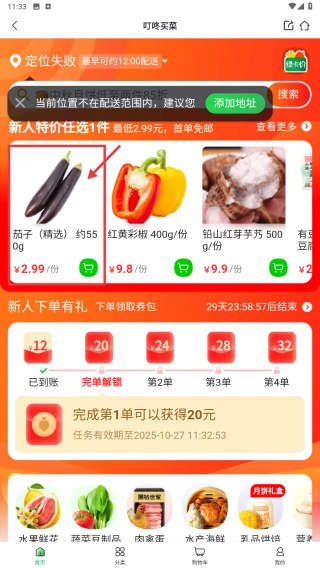 在叮咚买菜的商品分类里,找到你要的“茄子精选”这个目标商品,然后点击进入它的详情页面。