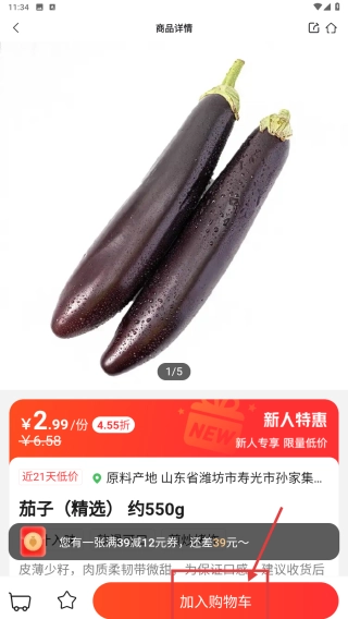 在商品详情页面,点击“加入购物车”按钮,把茄子添加到购物车中。