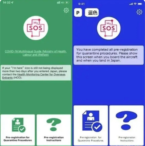 - 绿色、蓝色页面:所有的事前登记与审查流程均已完成,可使用快速通道,在搭乘飞机和入境时出示该界面即可。