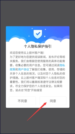 第一步,打开手机上的“云上胶州”页面,仔细阅读“用户使用许可协议”以及“隐私政策”,随后点击“同意”按钮。