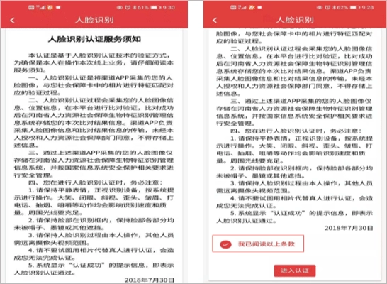 在阅读完人脸识别认证服务须知后,勾选“我已阅读以上条款”选项,接着点击“进入认证”按钮,随后在弹出的提示框中点击“同意”按钮,即可进入到下一个界面。