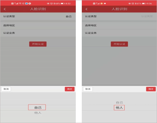选择认证类型时,若点击“自己”并确认,即为本人办理认证;若点击“他人”并确认,则为他人办理认证。