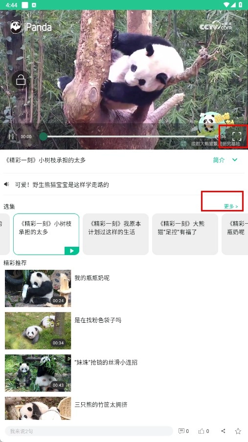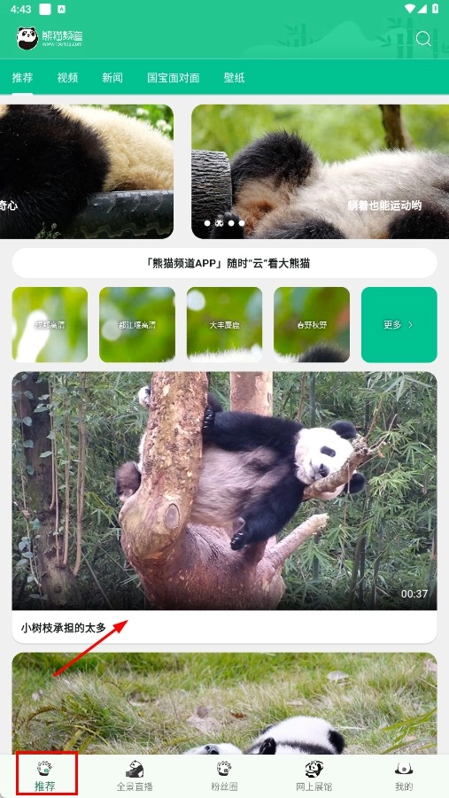 在推荐页面,点击你感兴趣的熊猫视频,比如【小树枝承担的太多-视频】,就能进入视频播放页面。