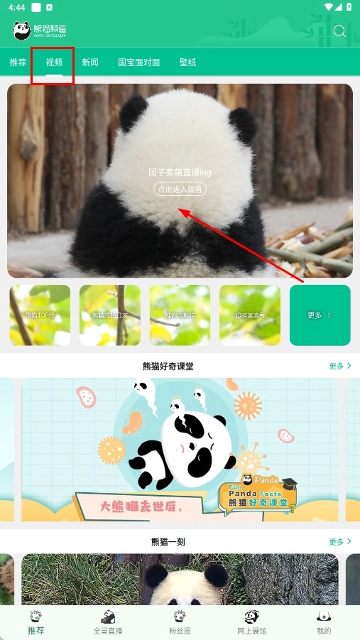 点击顶部的【视频-分类标签】,就能进入视频板块,在该板块里可以点击直播入口观看熊猫直播。