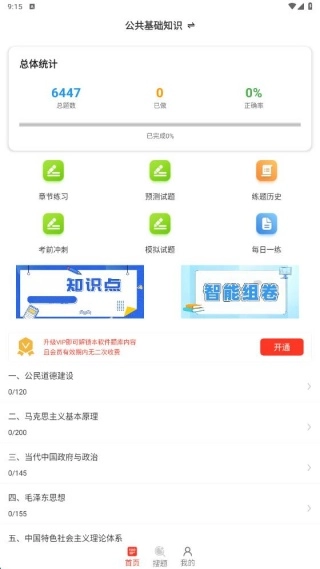 首页设有章节练习、练题历史、考试冲刺等功能板块,并且会按类别呈现各章节的题目数量。