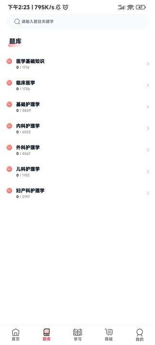 进入选择题库后,这里仍是题库界面,不过可以通过顶端的搜索框查找想练习的题目,只需输入关键词就行。